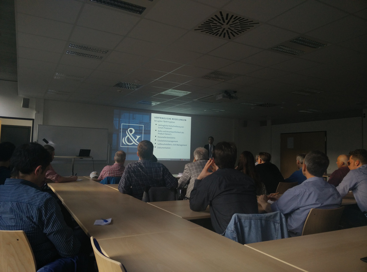 Im Anschluss daran referrierte RA Bilal Abedin zum Thema “Agile Verträge und Vergütungsvereinbarungen”: Agile Arbeitsmethoden bringen neue Herausforderungen für bestehende Vertrags- und Geschäftsmodelle. Dabei gibt es nicht die universale Lösung. In unserem Vortrag setzten wir uns zunächst mit bestehenden Konzepten (z.B. Werkvertrag und Dienstvertrag) auseinander. Mit diesen lassen sich zwar grundsätzlich auch agile Projekte vereinbaren. Das volle Potential der auf Vertrauen und Teamwork ausgelegten agilen Arbeitsweise kann man jedoch aus unserer Sicht gerade bei komplizierten Sachverhalten am besten mit Time & Material Verträgen ausschöpfen. Dabei können gleichwohl bestimmte Maßnahmen getroffen werden (insbesondere Eskalations- und Exitmanagement), um Probleme im Projektverlauf schnell und effizient lösen zu können oder im schlimmsten Fall die Arbeit mit einem anderen Anbieter fortzusetzen. Dies soll den Parteien trotz der Dynamik des Projekts zu einem gewissen Grad an Sicherheit verhelfen.