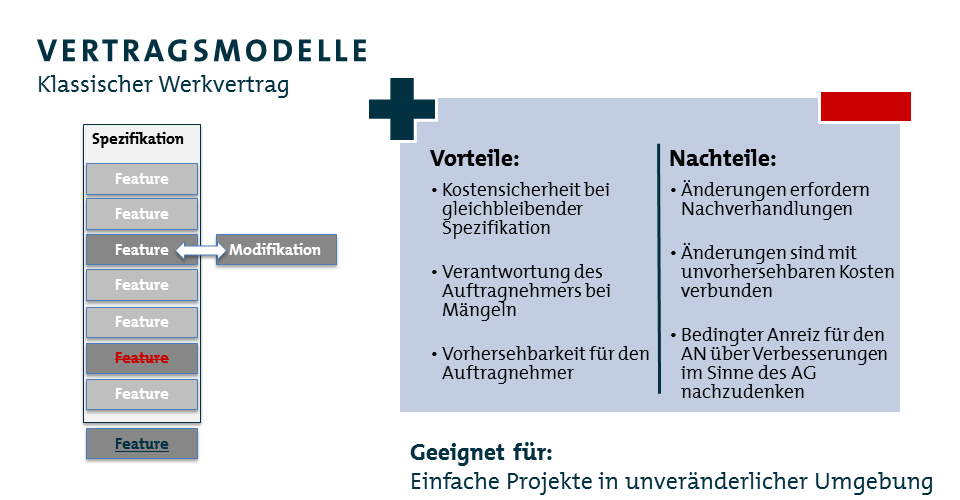 Der klassische Werkvertrag bildet hierbei das Ausgangsmodell. Beim Werkvertrag schuldet der Dienstleister die Erstellung eines mangelfreien Werks, gemessen auf Grundlage einer konkreten Spezifikation, die vor Arbeitsbeginn einmalig vereinbart wurde. Die Vergütung erfolgt über einen Festpreis und Änderungen an oder der Austausch von Features erfolgt im Rahmen von Change-Requests mit Preissteigerungen auf der Basis von Time and Materials. Der klassische Werkvertrag sieht somit eine Kostensicherheit bei gleichbleibender Spezifikation, die Verantwortung des Auftragnehmers bei Mängeln und dadurch eine Vorhersehbarkeit für Auftraggeber und Auftragnehmer vor. Dies bedeutet zugleich, dass Änderungen stets Nachverhandlungen erfordern, mit nicht-einkalkulierten Kosten verbunden sind und es bedingt Anreize für den Arbeitnehmer gibt, über Verbesserungen im Sinne des Arbeitgebers nachzudenken. Der klassische Werkvertrag ist in der Gesamtbetrachtung für einfache Projekte in unveränderlichen Umgebungen geeignet.