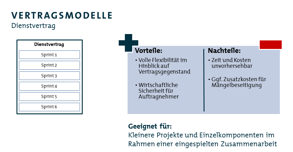 Der Dienstvertrag scheint demgegenüber eher auf die Bedürfnisse der agilen Projektleitung zugeschnitten zu sein. Beim Dienstvertrag schuldet der Dienstleister kein definiertes Ergebnis (Werk) sondern lediglich seine Arbeitsleistung in Form der Tätigkeit. Dadurch verschiebt sich das Erfolgsrisiko zu Lasten des Auftraggebers. Innerhalb des Projekts würde die Software in sogenannten Sprints entwickelt, bei denen jeweils einzelne User-Stories entwickelt und implementiert werden. Ein Sprint ist ein abgeschlossener Zeitrahmen innerhalb dessen vorher bestimmte Entwicklungsziele verwirklicht werden und auf den sofort der nächste Sprint folgt.[1] Die Vergütung erfolgt nach Aufwand, also Time and Materials. Dadurch bietet der Dienstvertrag eine völlige Flexibilität im Hinblick auf den Vertragsgegenstand und eine wirtschaftliche Sicherheit für den Auftragnehmer. Die Projektkosten können für den Auftraggeber jedoch nicht abschließend bestimmt werden, und so bleiben Zeit und Kosten unvorhersehbar. Die Mängelbeseitigung durch den Auftragnehmer führt unweigerlich zu Zusatzkosten für den Auftraggeber. Im Ergebnis ist der Dienstvertrag eher für kleinere Projekte für die Entwicklung von Einzelkomponenten geeignet, die im Rahmen einer bereits eingespielten Zusammenarbeit verwirklicht werden soll.