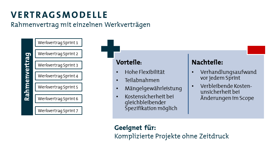 Einen Kompromiss versucht der Rahmenvertrag mit einzelnen, untergeordneten Werkverträgen darzustellen. Der Rahmenvertrag regelt hierbei die Beziehung von Auftragnehmer und Auftraggeber und fasst einen Großteil des Verhandlungsumfangs einmalig ab. Für jeden Sprint vereinbaren die Parteien sodann einen präzisen Scope mit umzusetzenden User-Stories zu einem festen Preis nach werkvertraglichem Charakter. Die Mängelbeseitigung erfolgt nach jeder Teilabnahme im Rahmen der gesetzlichen Gewährleistung. Dieses Modell erreicht eine hohe Flexibilität, ohne Kostensicherheit bei gleichbleibender Spezifikation zu gefährden und bietet durch die Teilabnahmen und die gesetzliche Gewährleistung einen hervorragenden Ausgleich in der Qualitätssicherung. Jedoch ist jeder Sprint mit einem Verhandlungsaufwand verbunden und die beabsichtigte Agilität, also Änderungen im Scope, führen zu Kostenunsicherheiten. Der Rahmenvertrag mit einzelnen Werkverträgen ist demnach besonders gut für komplizierte Projekte geeignet, an denen ohne Zeitdruck gearbeitet werden kann.