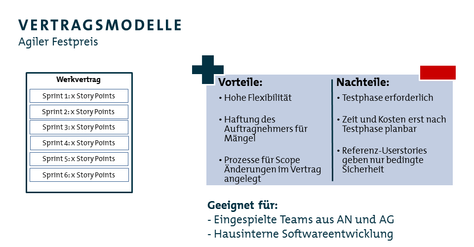 Das Vertragsmodell des agilen Festpreises ist die Fortentwicklung und Anpassung des Werkvertrages mit Werkzeugen, die durch die agile Arbeitsweise selbst bereitgestellt werden. Hierbei werden im Rahmen einer Testphase Referenz-Userstories festgelegt, anhand derer dann allen User-Stories Storypoints zugewiesen werden. Die Parteien vereinbaren einen Festpreis für eine bestimmte Anzahl von Storypoints, die in den jeweiligen Sprints vom Auftraggeber genutzt flexibel genutzt werden können. Die Haftung des Auftragnehmers für Mängel ergibt sich aus den werkvertraglichen Regelungen. Durch dieses Modell wird eine hohe Flexibilität in der Ausgestaltung der Arbeitsleistung vorgesehen, ohne die Haftung des Auftragnehmers für die eigene Arbeitsleistung zu berühren. Change-Requests und Änderungen des Scope unterliegen klaren Prozessen, die im Vertrag beschrieben sind. Die Erforderlichkeit der Testphase und die Möglichkeit, Zeit und Kosten erst nach der Durchführung dieser Testphase bestimmen zu können, verursachen bei den Beteiligten dahingegen einen unproduktiven, möglicherweise sogar vergeblichen Aufwand. Das agile Festpreismodell ist für eingespielte Teams aus Auftragnehmern und Auftraggebern geeignet, insbesondere bei hausinterner Softwareentwicklung.