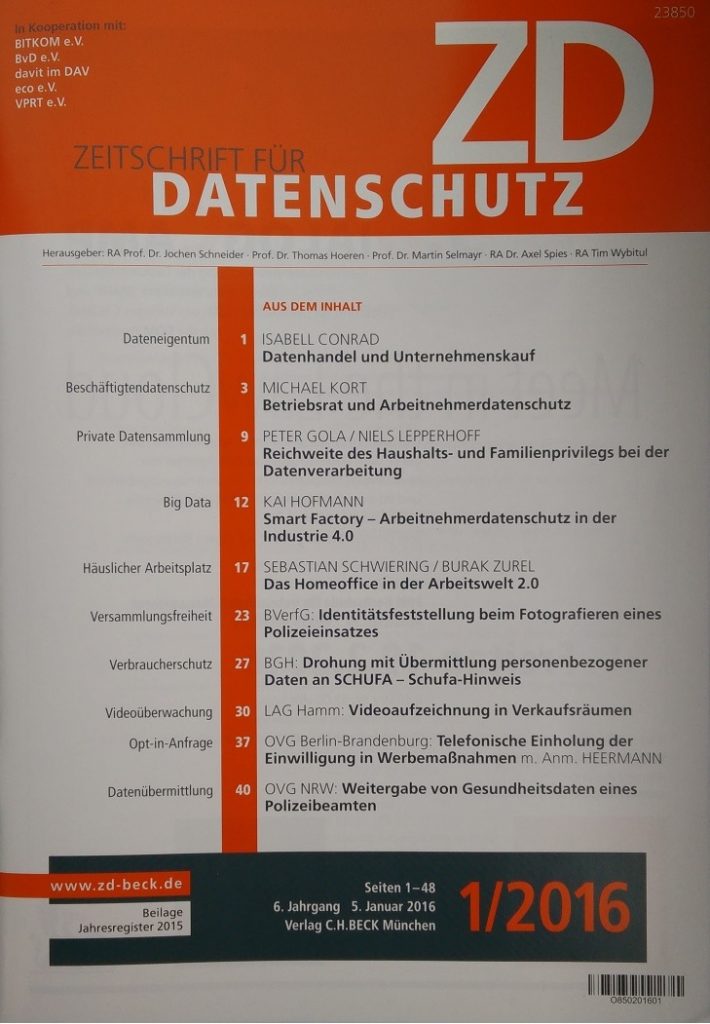 Gemeinsam mit unserem wissenschaftlichen Mitarbeiter Burak Zurel habe ich einen Beitrag zum Thema “Das Homeoffice in der Arbeitswelt 2.0 – Rechtliche Rahmenbedingungen für Telearbeit” in Ausgabe 1/2016 der Zeitschrift für Datenschutz veröffentlicht.